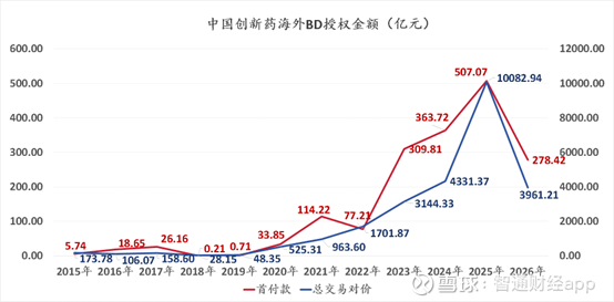 2026年全球资本继续横扫中国生物资产,2026年仅前两个月,中国创新药领域的BD交易总包金额已突破500亿美元,接近2025年全年的四成;其中首付款超30亿美元,超过2025年全年的四成。