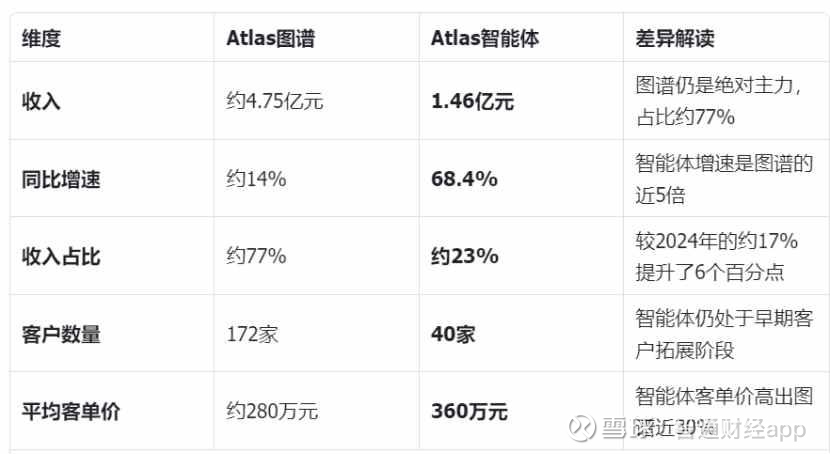 海致科技的收入由两大板块构成——Atlas图谱解决方案(核心基本盘)和Atlas智能体解决方案(第二增长曲线)。2025年的全量数据如下: