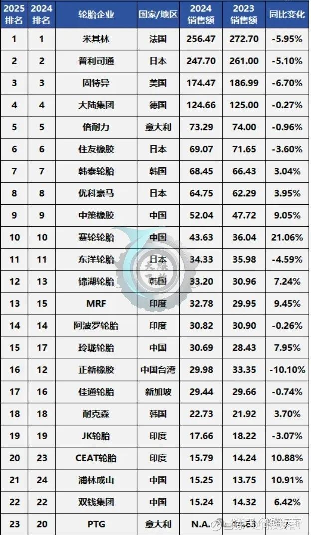 2024年赛轮轮胎排名全球第十,米其林256亿美元排名第一,中策橡胶52亿美元排名第九,增长9%,赛轮轮胎43.6亿美元排名第十,增长21%。