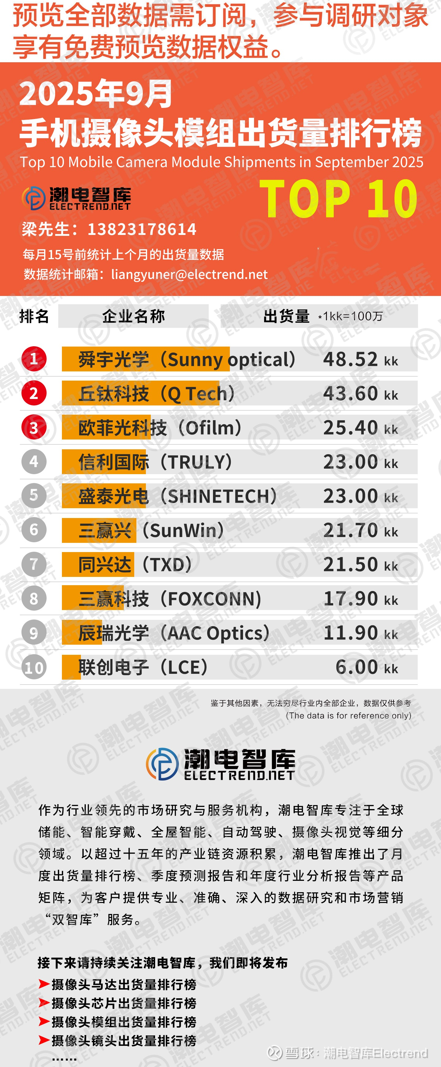 2025年9月手机摄像头模组TOP10出货总量为242.52KK,其中舜宇光学科技作为行业龙头,以48.52KK领衔榜首,环比大幅增长15.3%,同比增长32%。这一数据表明,随着下半年消费电子旺季的到来,市场需求正持续回暖、丘钛科技同样表现强劲,9月手机摄像头模组出货量为43.60KK,丘钛科技在公告中明确指出,增长主要源于集团在手机摄像头模组业务的市场份额上升。