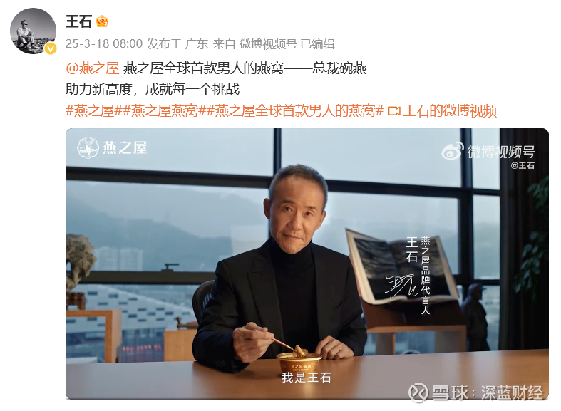 18日,“燕窝第一股”燕之屋官宣品牌代言人王石,并推出“燕之屋全球首款男人的燕窝”——总裁碗燕。