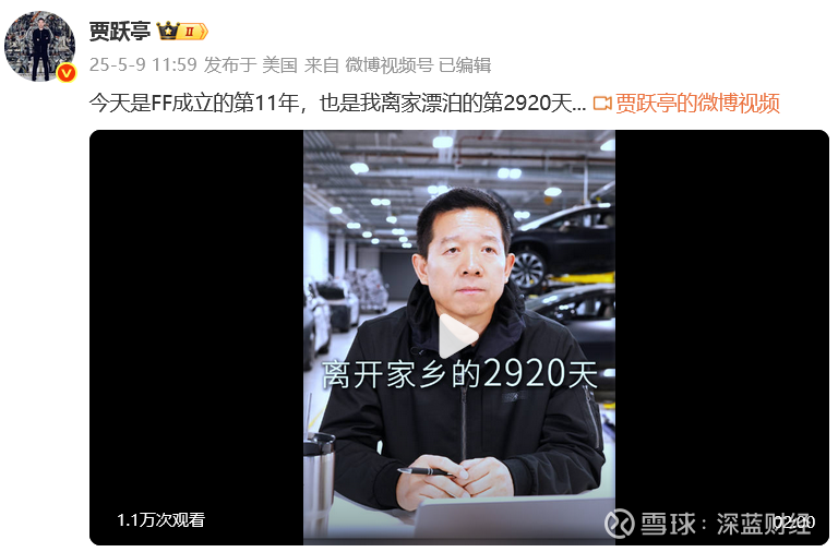 5月9日,FF创始人、乐视创始人贾跃亭发视频纪念FF成立第11周年,主动提及想家想回北京,表示“还债回国”的时间不会太远。