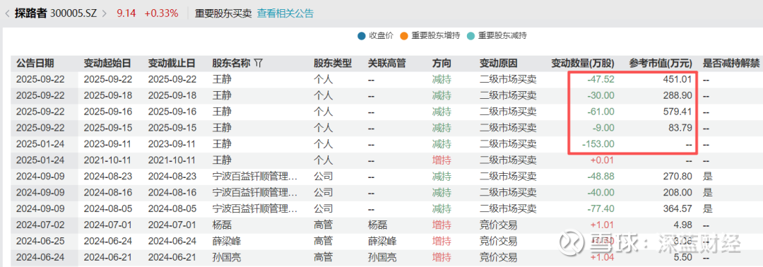 9月22日,探路者(300005.SZ)一则简式权益变动报告书再次打破市场平静,创始人之一王静在9月15日至22日间再次减持147.52万股,持股比例从5.17%降至4.99%,正式退出5%以上股东行列。据wind数据,累计减持金额约1403万元。虽然金额不大,但从本月接二连三的减持行动来看,创始人家族套现离场似乎更加坚决了。