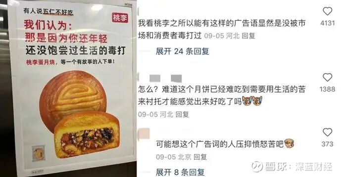 这款月饼的广告语为,“有人说五仁不好吃,我们认为:那是因为你还年轻,还没饱尝过生活的毒打。桃李蛋月烧,等一个有故事的人下单!”