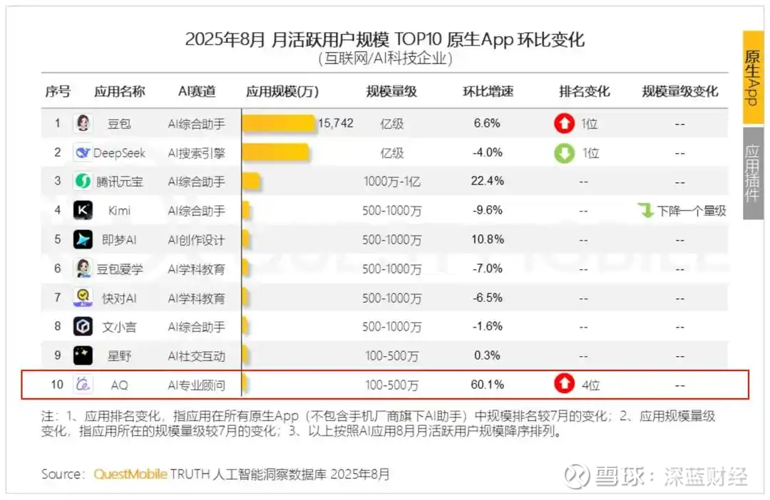 9月16日,市场研究机构QuestMobile最新发布的2025年8月移动互联网数据显示,豆包月活用户达1.5742亿,首超DeepSeek,首次登顶中国原生AI应用月活榜首。其增长源于抖音等超级入口引流、功能持续迭代及端侧AI体验优化,保持行业领先地位。