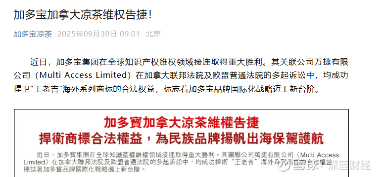 9月30号,加多宝在公众号发文称,其关联公司万捷有限公司在加拿大联邦法院、欧盟普通法院的多起诉讼中,成功捍卫了“王老吉”海外系列商标的合法权益。