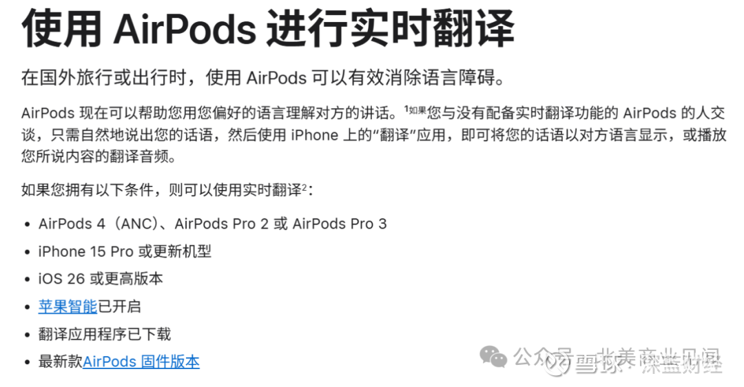 苹果称,只要拥有AirPods 4(ANC)、AirPods Pro 2或AirPods Pro 3,配合运行iOS 26的iPhone 15 Pro或更新机型,就可以利用手机自带的Apple Intelligence功能,将自己说的话翻译成对方可以理解的语言,向对方显示或是播放出来。