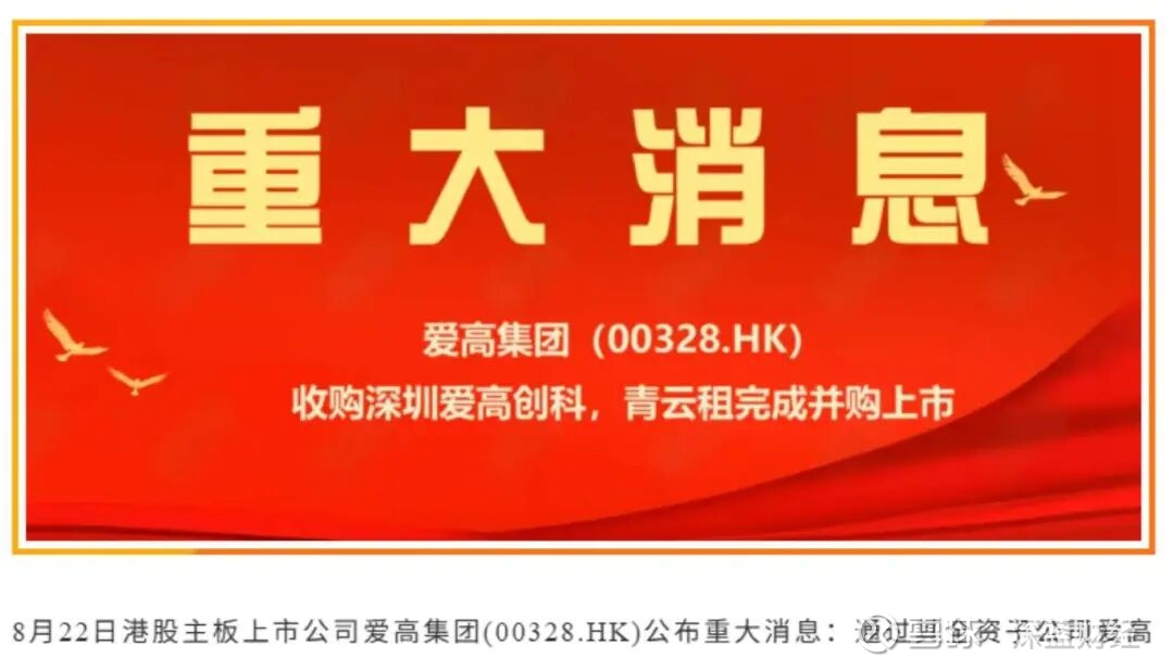 一个月后,8月23日,“青云租”在官网发布“重大消息”,宣布爱高集团(00328.HK)通过其全资子公司爱高立科有限公司收购深圳爱高创科控股有限公司11%股权,持股比例升至51%,成为合资公司第一大股东。这意味着,青云租控股公司正式并入爱高集团旗下。