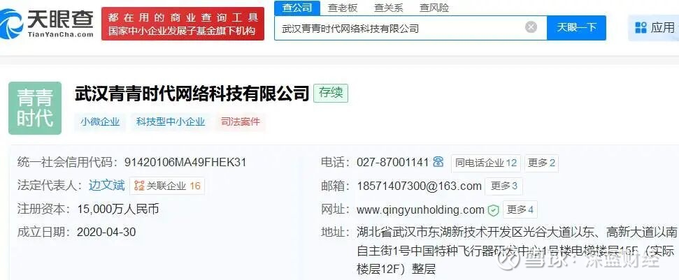 据天眼查显示,“青云租”所属公司为武汉青青时代网络科技有限公司,成立于2020年,注册资本达1.5亿元,法定代表人是边文斌。