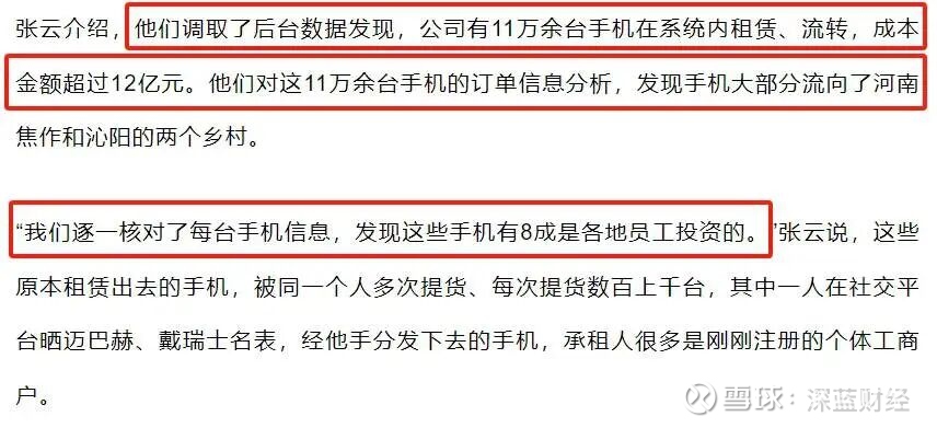 据封面新闻11月10日的调查报道,公司员工有重大发现:“他们调取后台数据发现,公司有11万余台手机在系统内租赁、流转,成本金额超过12亿元。他们对这11万余台手机的订单信息分析后发现,手机大部分流向了河南焦作和沁阳的两个乡村。”