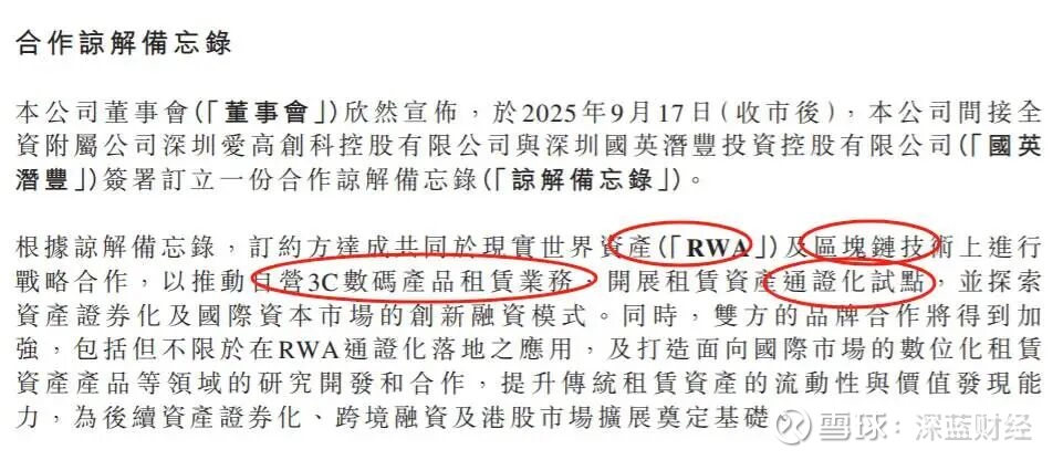 爱高集团也于9月17日发布公告,称计划与国英潜丰合作,试点3C数码产品租赁资产通证化,采用RWA和区块链技术。