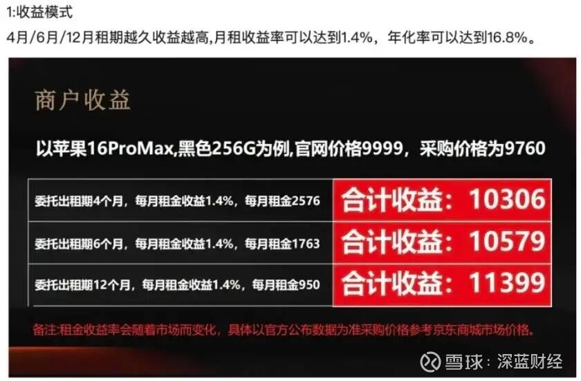 根据新闻报道的资料,以苹果16PM手机为例,官网价格9999元,平台采购价格9760元;投资者委托平台出租,4个月即可获得10304元收益,实现回本。投资期限分为4个月、6个月、12个月,投资越久收益越高,年化率可达16.8%。