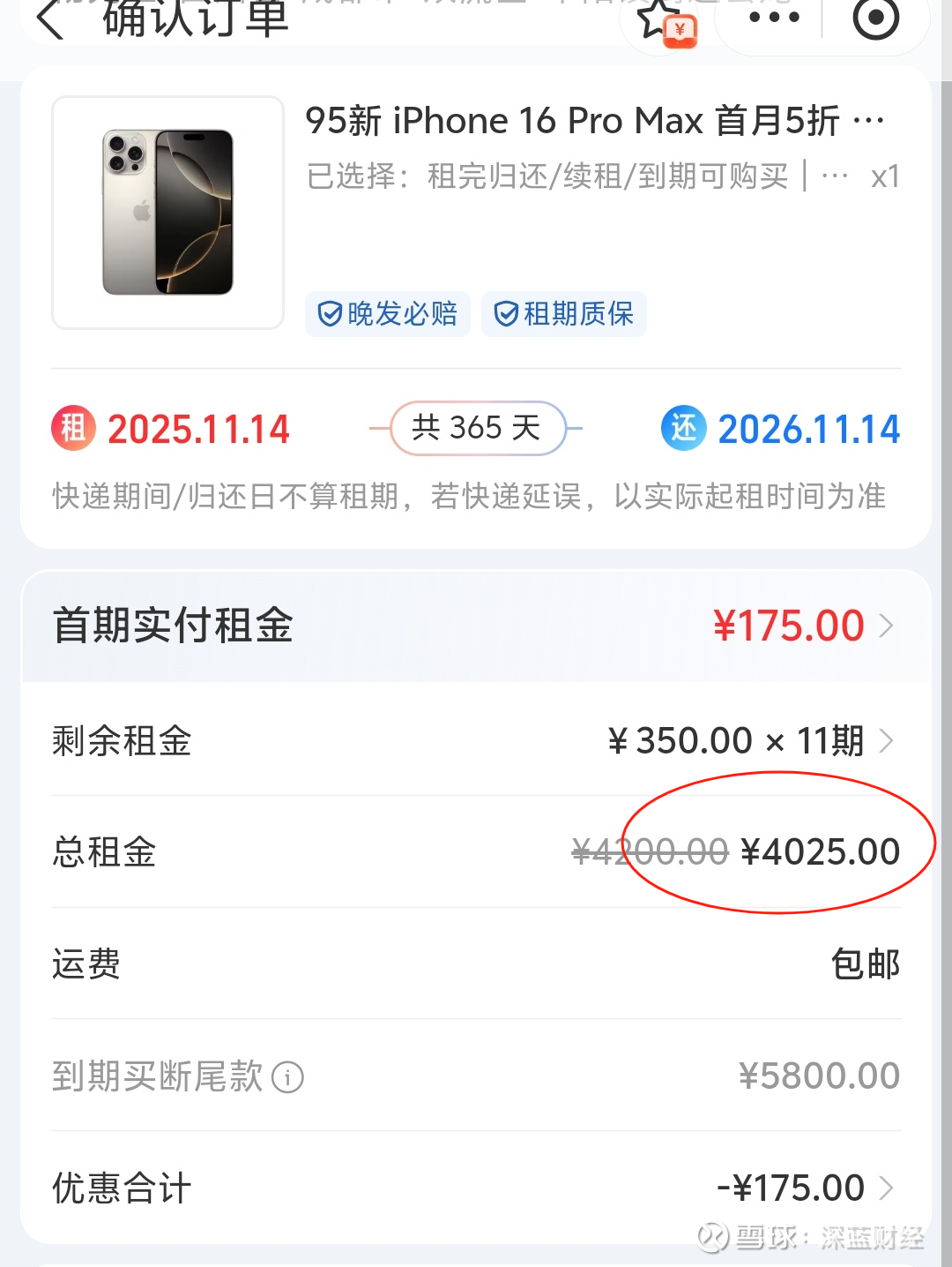 但是租手机平台很多。小编以支付宝平台为例,上面95新的同款苹果手机,仅需11.03元一天,租一年费用为4025元。