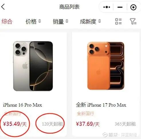 青云租将苹果16PM手机的出租价格定为35.49元/天。按照该手机9760元的平台采购价计算,若全年无休满租,全年可获得租金12953元,折合采购价的回报率高达132%。