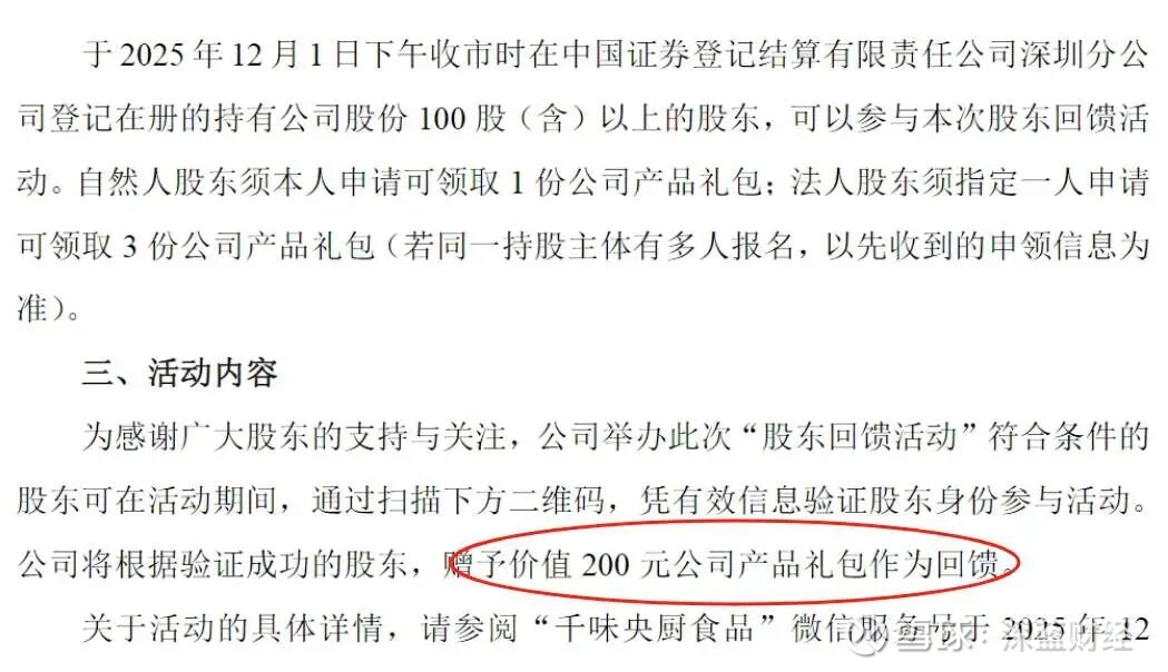12月2日,千味央厨公告,截止上一日收盘持有100股的股东,即可领取一份价值200元的礼品!