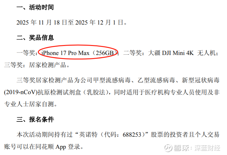 11月17日晚间,英诺特(688253.SH)公告,拟开展“上市公司股东节”股东回馈活动,报名条件为活动期间持有过英诺特股票的投资者且个人交易账户可以在同花顺App登录。活动设置三个等级的奖项。其中,一等奖为苹果手机;二等奖为大疆DJI Mini 4K无人机;三等奖为居家检测产品。
