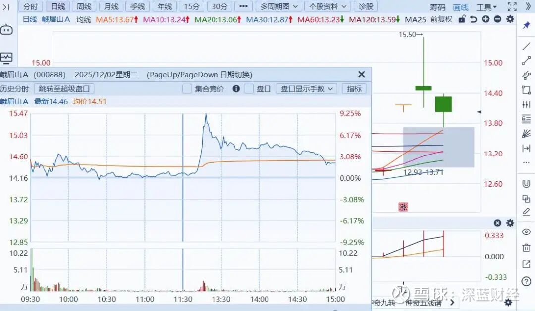 以峨眉山A为例,昨天股价冲高回落,当日振幅高达10%,今天大跌4.84%,昨天冲进去的羊毛党欲哭无泪...