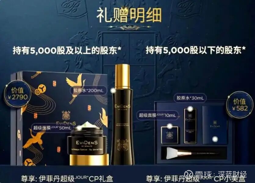 今年7月,水羊股份开展2025年度“股东尊享臻礼回馈”活动。截至6月12日收市后持有公司5000股以下的股东,赠送一套“伊菲丹超级JOURCP小美盒”,价值359元。5000股(含)以上的股东,赠送一套“伊菲丹超级JOURCP正装礼盒”,价值2740元。