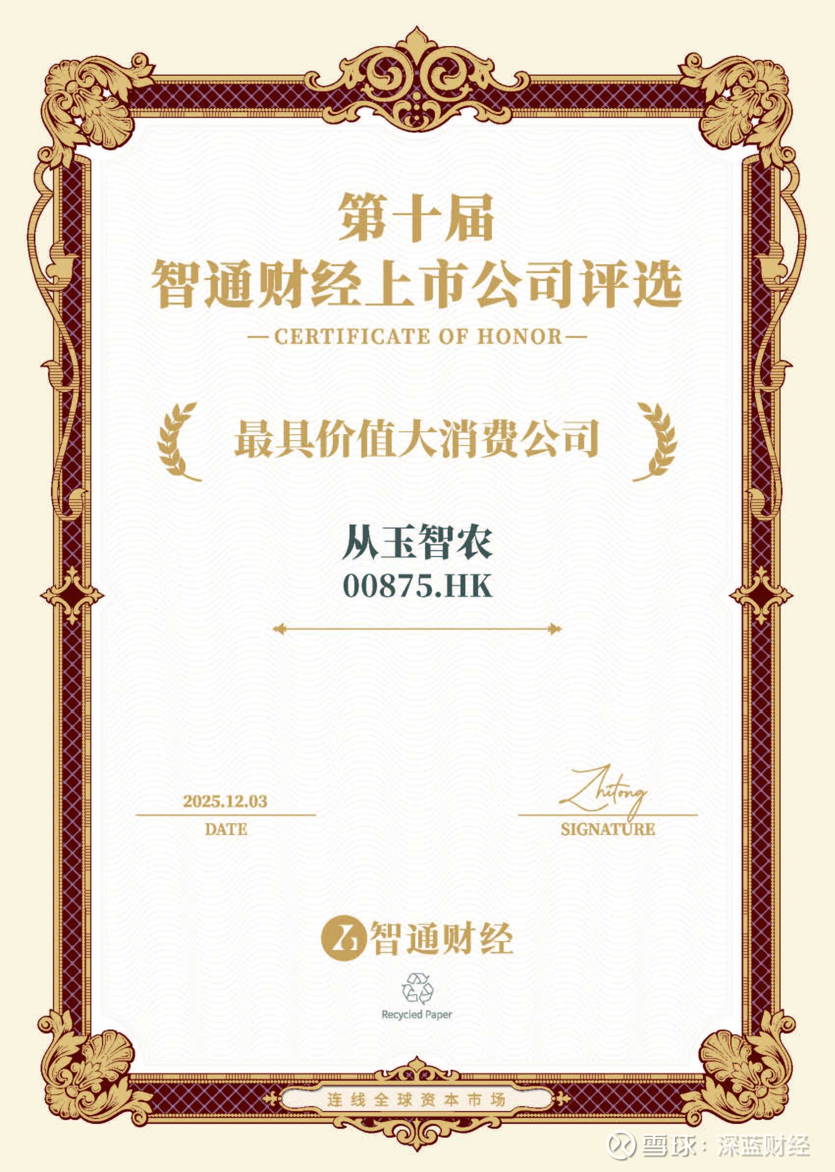 2025年12月3日,在“第十届智通财经上市公司颁奖盛典”上,从玉智农(00875)荣获 “最具价值大消费公司” 奖,其健康的治理结构、显著的行业地位、稳健的主营业务及持续为投资者创造稳定回报的综合实力备受肯定。该颁奖盛典由智通财经与新智基金网联合主办、冬日暖阳Donova独家承办的。
