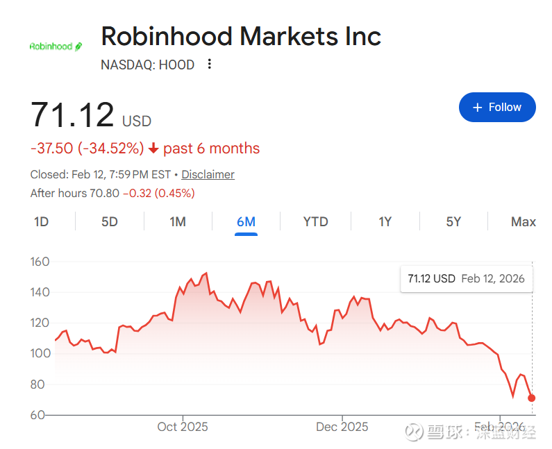 此次下跌很大程度上归因于投资者对其最新财报的失望。 2月11日,Robinhood股价收于78.07美元,单日跌幅达8.69%。