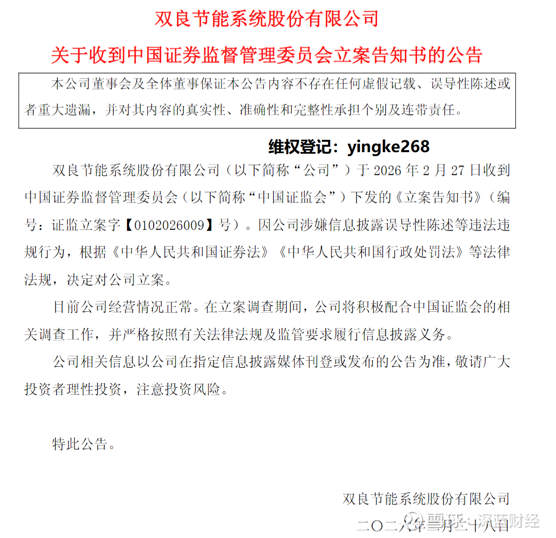 公开信息显示,双良节能曾于2月12日因误导性陈述被上交所出具警示函,目前尚不清楚此次被立案是否与警示函所载明的误导性陈述有关。据北京市盈科(济南)律师事务所证券维权团队的沈涛律师介绍,上市公司信息披露违法都是严重侵害中小股民权益的行为,一旦证监会调查确认其存在信息披露违法违规,根据《证券法》及最高人民法院司法解释的规定,受损投资者都可以要求上市公司给予赔偿,目前其团队正通过微信yingke268接受股民咨询和索赔登记,凡是在2026年2月27日收盘前买入相关股票的投资者均可联系登记索赔。