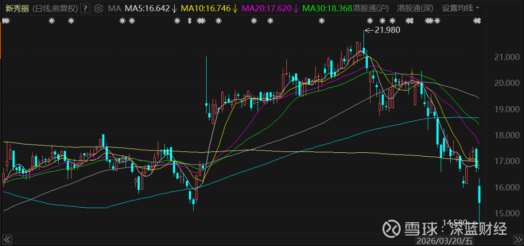 3月20日盘中,新秀丽下跌约8%,保持在15港元/股以上。
