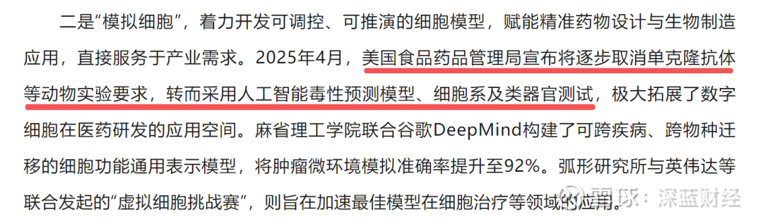 今年2月26日,《学习时报》刊登一篇文章,《积极抢占数字细胞科技制高点》。里面提到了“模拟细胞”,也就是FDA去年推动的逐步取消动物实验,转向AI毒性预测、类器官测试。