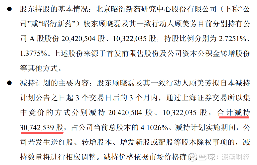 起因是周日晚间,昭衍新药公告,第四大股东顾晓磊和第七大股东顾美芳(姑侄关系)打算清仓,把手里3074万股全抛了,占总股本4.1%。清仓理由,就6个字——自身资金需求。