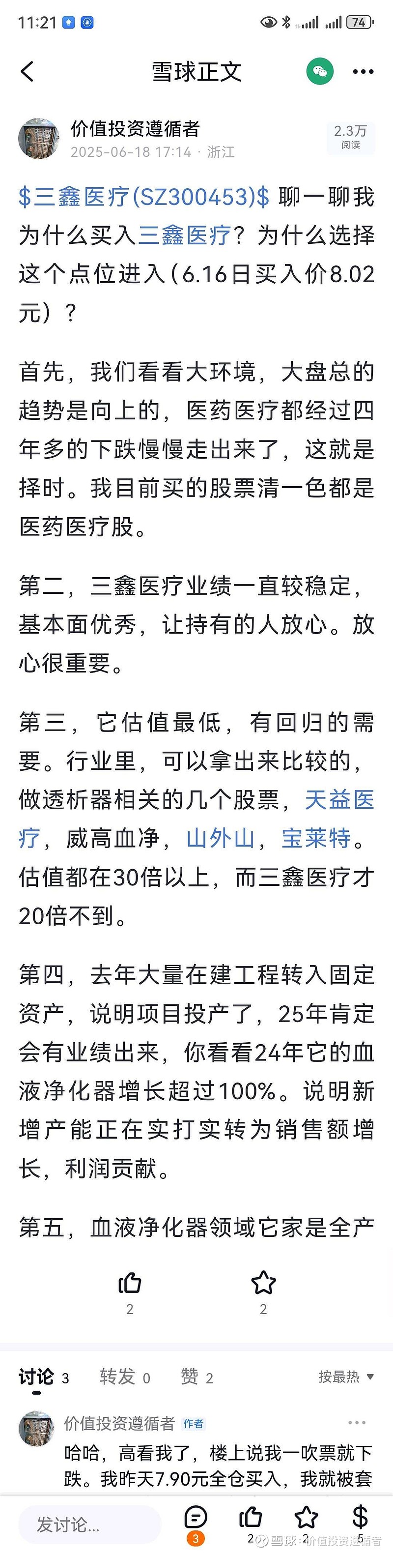 开贴前我先发一张我在雪球的文章截图,那时我第一次买入三鑫医疗。对它的分析,买入,卖出,总是需要理由的,我看了些资料后,我认为它值得我入手。