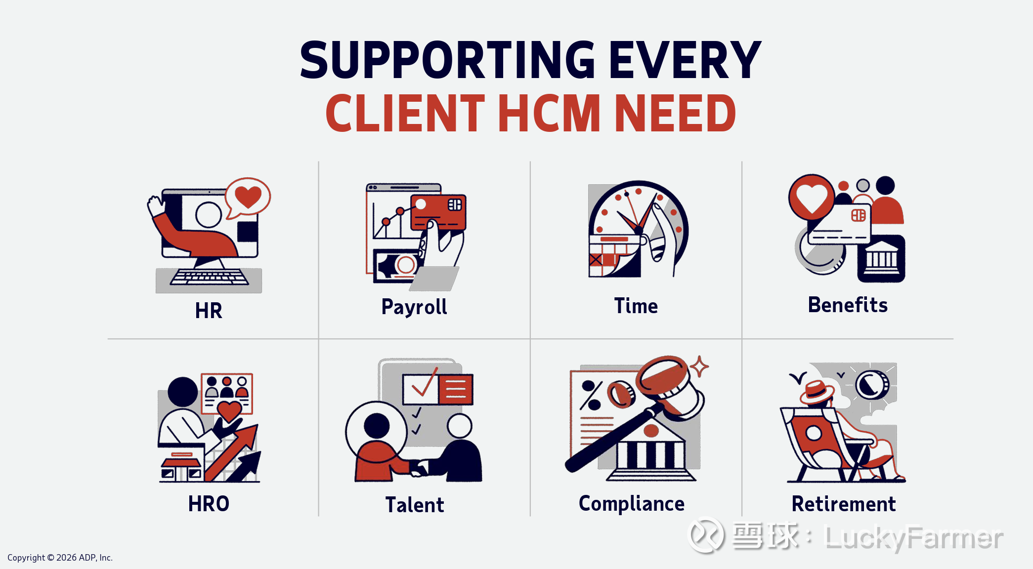 * **PEO Services (ADP TotalSource)**:通过共同雇主模式(Co-employment)深度嵌入中小企业,不仅提供 HR 服务,还利用规模效应为客户代办医疗保险和福利。
