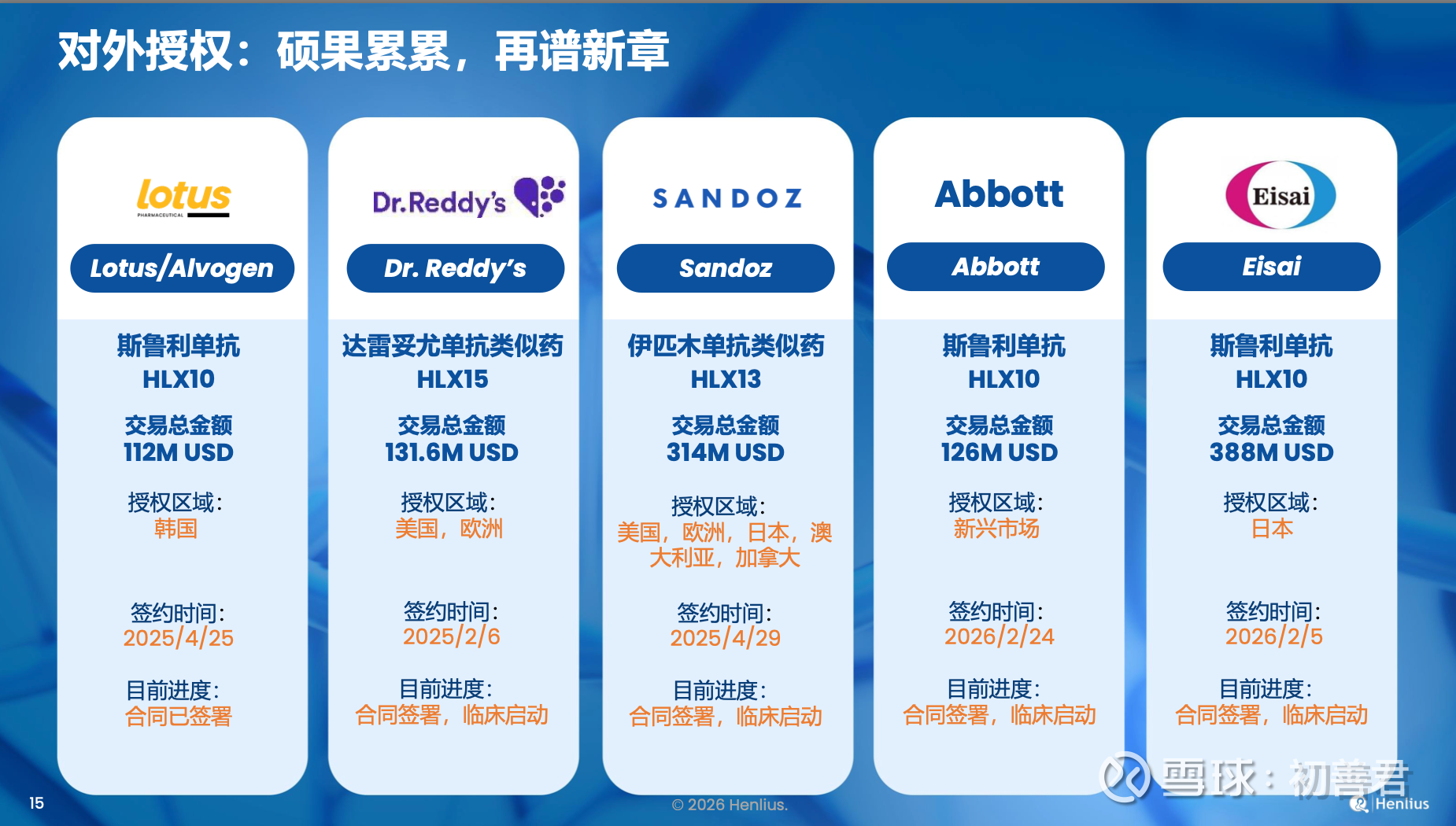 如果说百济神州是自主商业化的代表,复宏汉霖就是合作共赢的典范。熟悉复宏汉霖的朋友应该知道,2025年以来公司进入了BD合作的新一轮爆发期,并且创造了一系列历史。比如。PD-1抗体日本市场权益授权给卫材,收入款7500万美元,总金额3.88亿美元,创下中国药品日本单地区授权最大规模纪录。