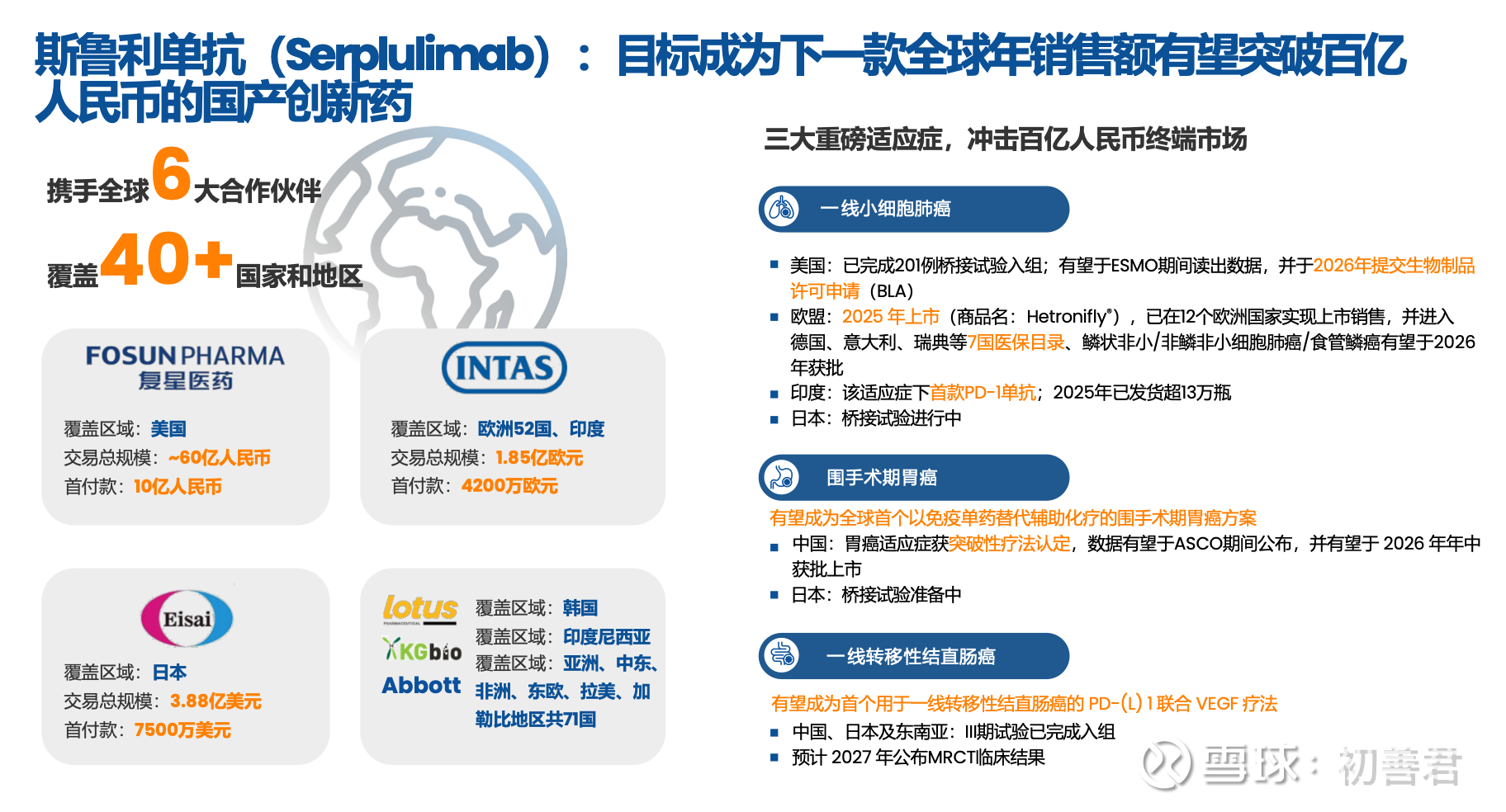 欧盟市场:鳞状/非鳞状非小细胞肺癌、食管鳞癌三大适应症均有望于2026年获批,商业化将逐步起量。