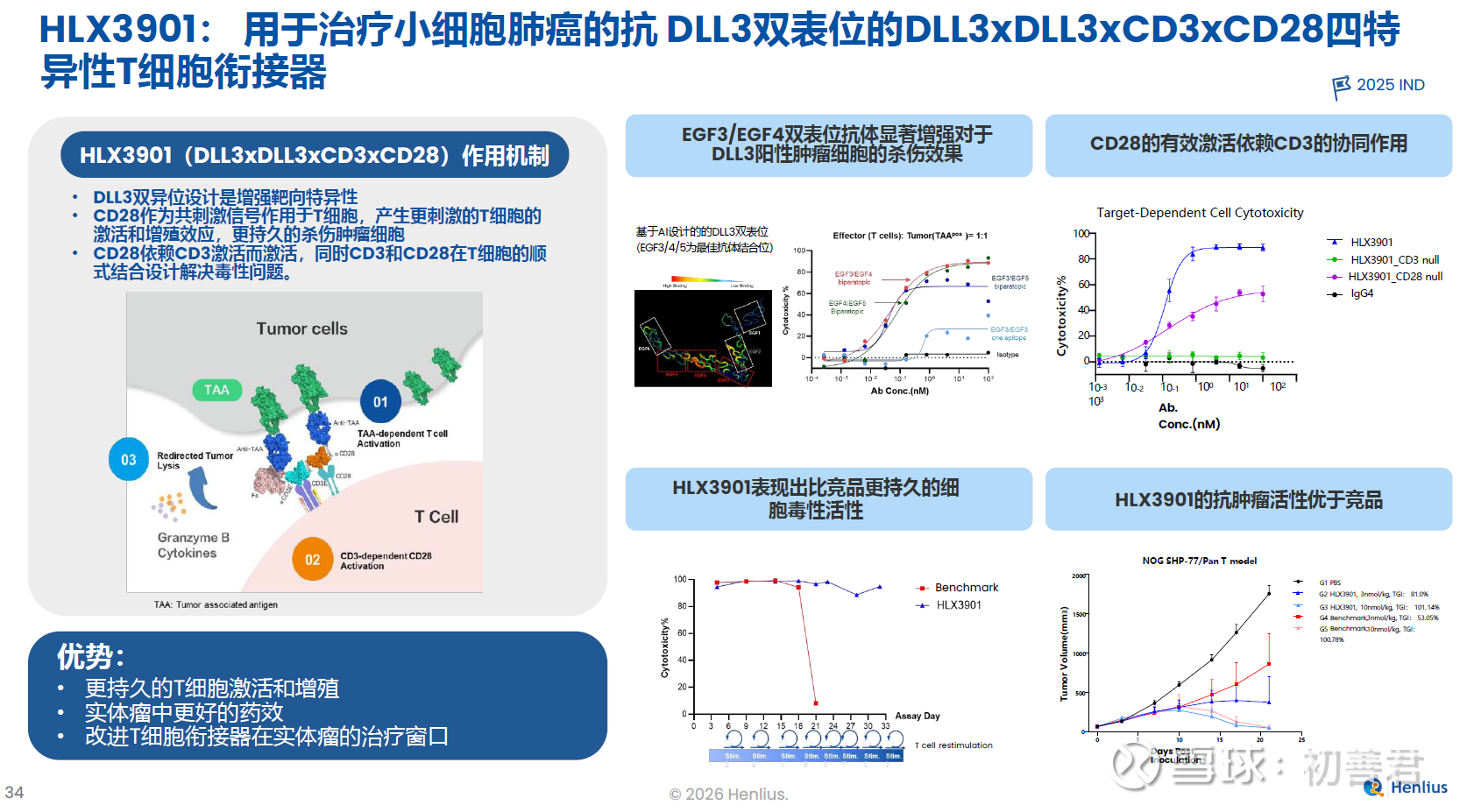 另一个是DLL3/DLL3/CD3/CD28四抗HLX3901,该分子通过双表位增强靶向特异性,有望进一步增强疗效的同时解决毒性问题。