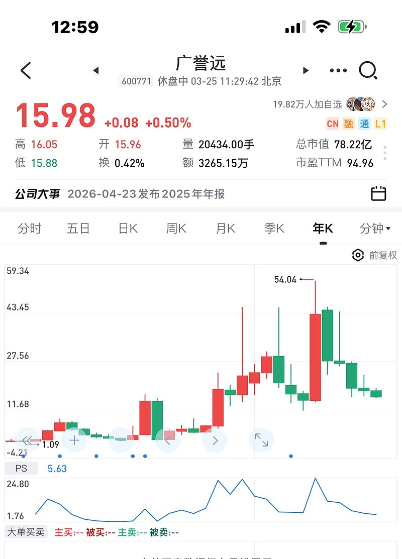 刚才。我打开广誉远的年线图。五年前的高点,54.04元。我不知道这位朋友是什么价位买进去的。50元?45元?不管哪个价位,今天的价格是16元多。跌掉了三分之二。十万块变成三万三,五十万变成十六万五,一百万变成三十三万。