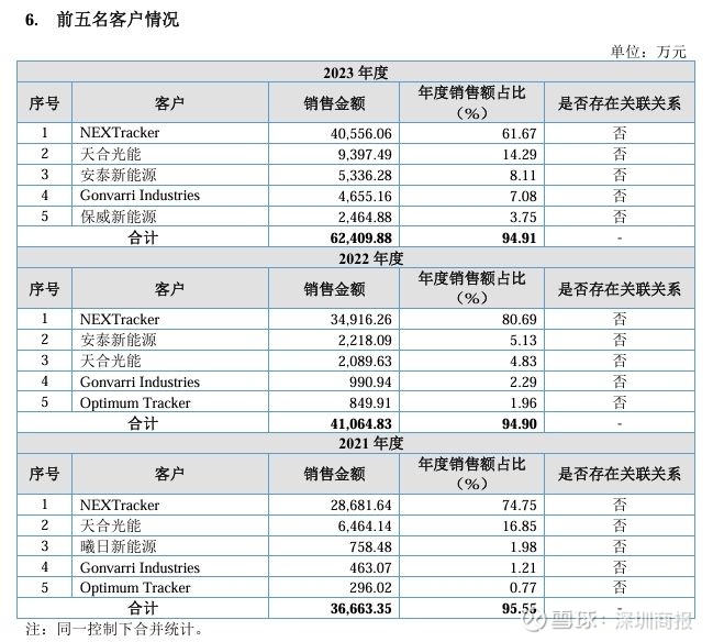 据招股书披露,2021年至2023年,公司对前五大客户的销售额占营业收入的比例分别为95.55%、94.90%和94.91%;其中,公司对第一大客户NEXTracker收入占营业收入比例分别为74.75%、80.69%和61.67%,客户集中度较高。