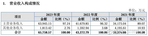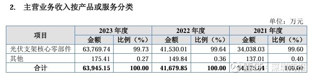 招股书显示,2021年至2023年,公司营业收入分别为3.84亿元、4.33亿元及6.58亿元。公司主营业务收入主要为光伏支架核心零部件的销售收入,占营业收入比重分别为89.07%、96.32%及97.24%,主营业务突出。