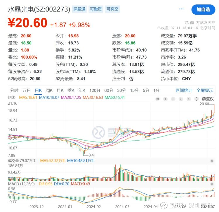 二级市场上,水晶光电股价创上市以来新高。截至11日收盘,水晶光电报20.60元/股,上涨9.98%,总市值286.47亿元,今年累计上涨53%。