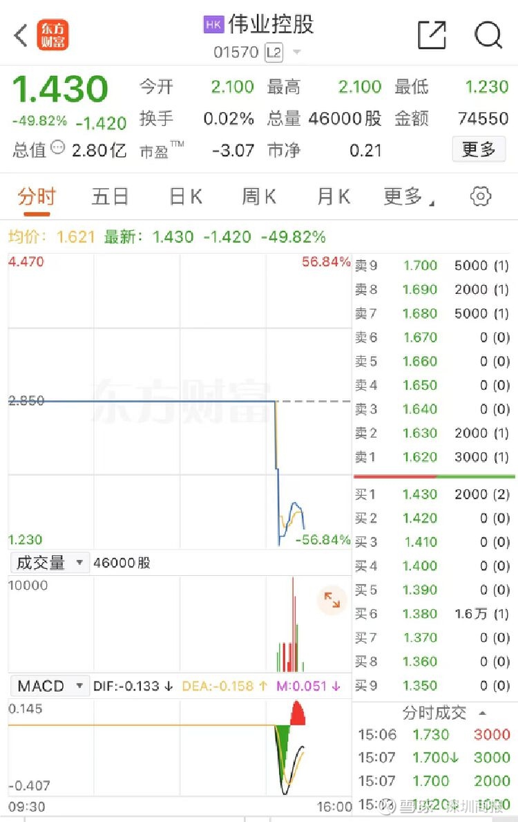 10月21日午后,伟业控股(01570)跌近50%,盘中股价创4年多来新低,截至发稿报1.43港元/股,总市值2.8亿港元。