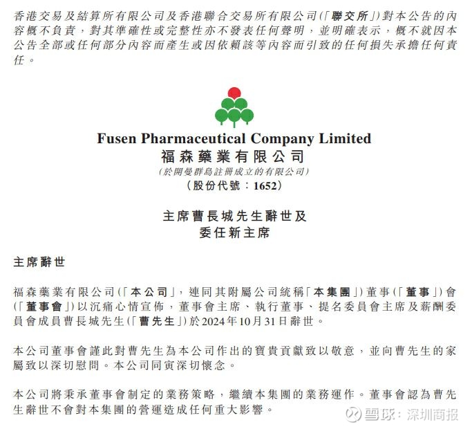 11月4日,港股上市公司福森药业(01652)公告,公司董事会主席、执行董事、提名委员会主席及薪酬委员会成员曹长城于2024年10月31日辞世。