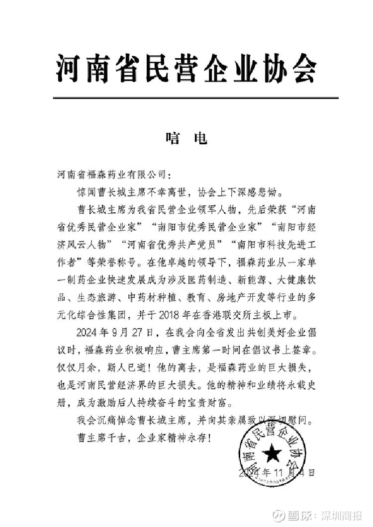 11月4日下午,河南省民营企业协会致唁电,沉痛悼念福森药业曹长城主席。