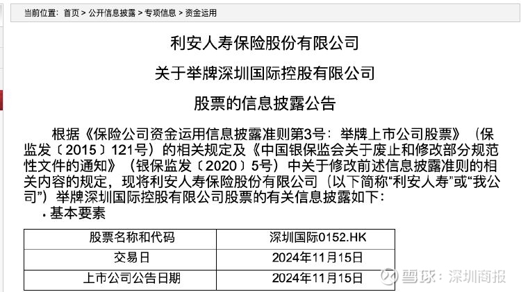 利安人寿称,以2024年11月15日深圳国际股票收盘价6.34港币和同日日终港元兑人民币汇率为基准,公司持有深圳国际股票市值为人民币7.13亿元,占公司上季度末总资产的比例为0.59%。