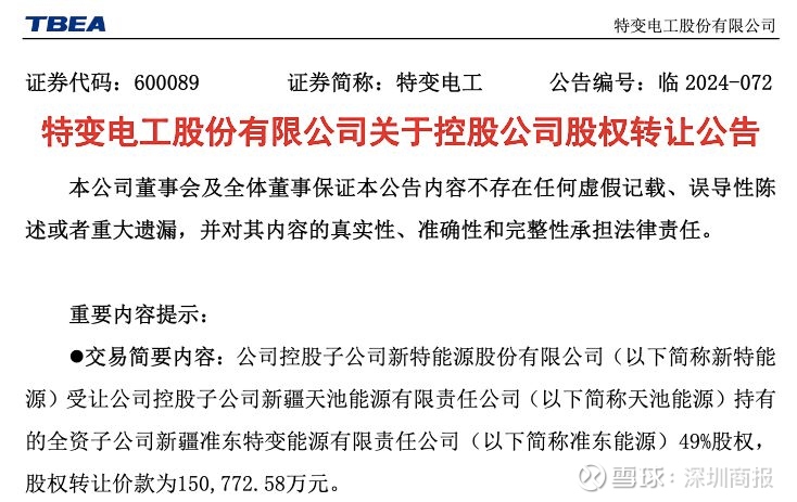 国内特高压设备龙头企业特变电工(600089)12月6日晚间发布公告称,公司控股子公司新特能源股份有限公司(简称“新特能源”)受让公司控股子公司新疆天池能源有限责任公司(简称“天池能源”)持有的全资子公司新疆准东特变能源有限责任公司(简称“准东能源”)49%股权,股权转让价款为15.08亿元。