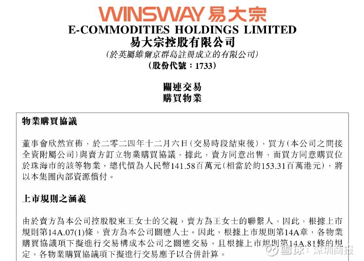 易大宗透露,由于卖方本公司控股股东王女士的父亲,本次交易构成关连交易。