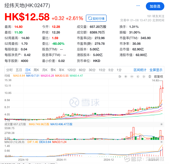 继昨日暴涨87.46%后,今天早盘经纬天地(HK:02477)盘中再度大涨超20%,股价两日内实现翻倍。截至下午发稿,经纬天地涨2.61%报12.58港元/股,总市值62.90亿港元。
