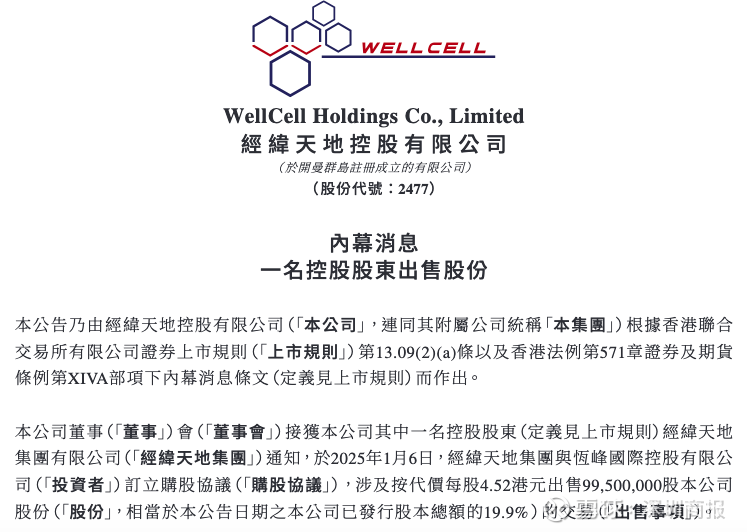 消息面上,经纬天地此前公告称,1月6日,一名控股股东经纬天地集团与独立第三方恒峰国际控股有限公司(以下简称恒峰国际)订立协议,拟出售9950万股,约占公司总股本19.9%;每股作价4.52港元,较当日收报折让30.89%,套现近4.5亿港元。交易完成后,经纬天地集团对公司的持股比例将由目前51%减少至31.1%,仍为控股股东。