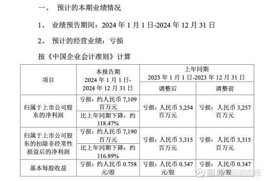 1月24日晚间,鞍钢股份有限公司(以下简称“鞍钢股份”或“公司”)发布2024年度业绩预告。公司预计2024年1-12月预计增亏,归属于上市公司股东的净利润为-71.09亿,净利润同比下降118.47%,预计基本每股收益为-0.7580元。