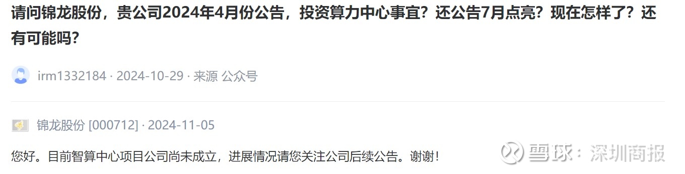 算力是近年科技界乃至资本市场最为热门的话题之一,在投资者互动平台上,亦有不少投资者对公司转型算力之举表示关注。记者注意到,2024年11月5日,就投资者在互动平台相关提问,公司回应称,目前智算中心项目公司尚未成立。