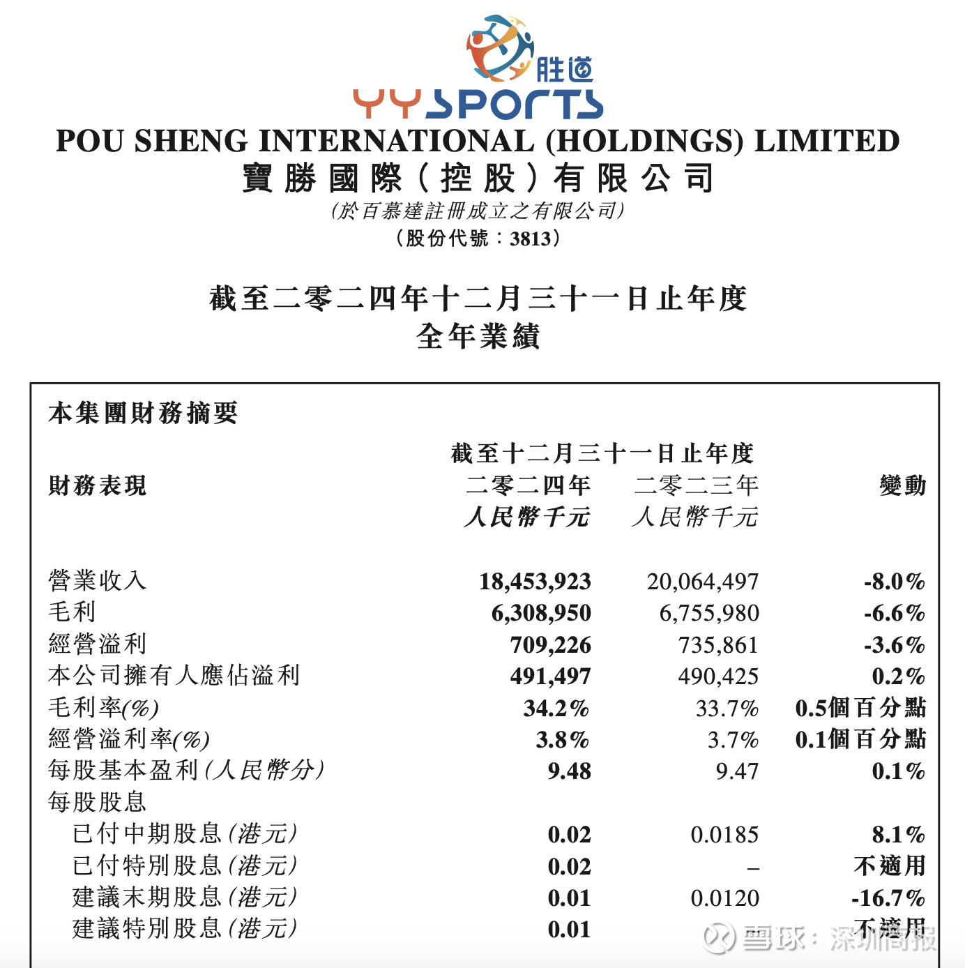 近日,Nike、Adidas等国际一线运动品牌的中国代理商宝胜国际(03813.HK)发布公告,2024年,集团录得营业收入184.539亿元,较2023年减少8.0%。毛利为63.089亿元,较2023年减少6.6%。2024年公司拥有人应占溢利同比仍维持稳定,达4.91亿元。每股基本盈利9.48分。