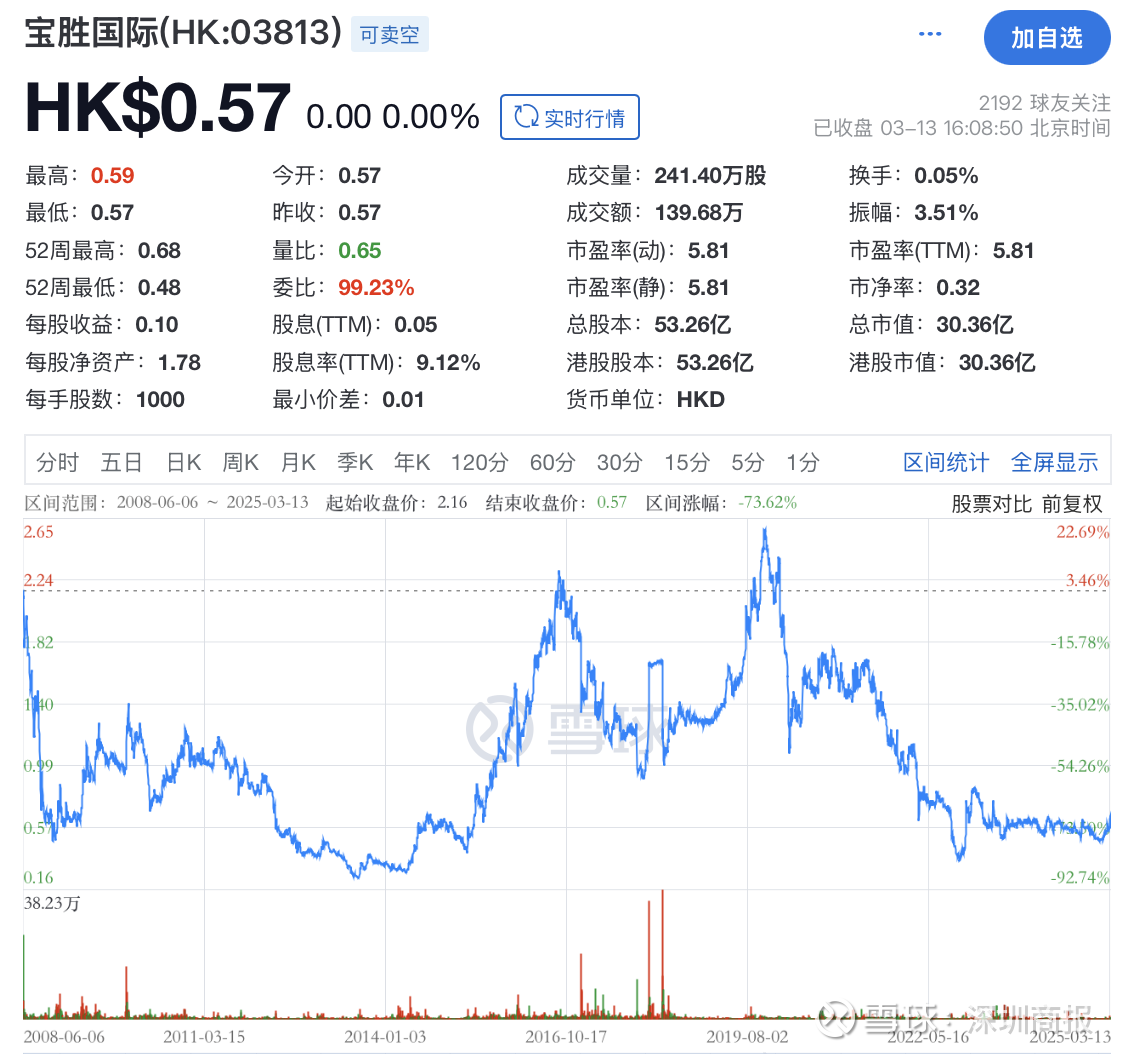 宝胜国际于2008年在香港联交所主板上市。截至3月13日收盘,股价已下跌至0.57港元/股,总市值30.36亿港元。