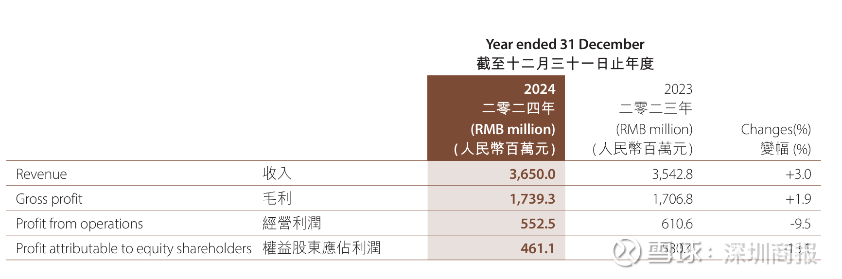 3月18日午间,男装品牌中国利郎(港股代码:01234)发布2024年年度业绩。数据显示,该公司报告期内收入为36.5亿元,同比增长3%;毛利为17.39亿元,同比增长1.9%;经营利润为5.53亿元,同比减少9.5%;权益股东应占利润为4.61亿元,同比减少13.1%。